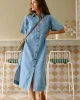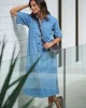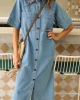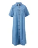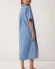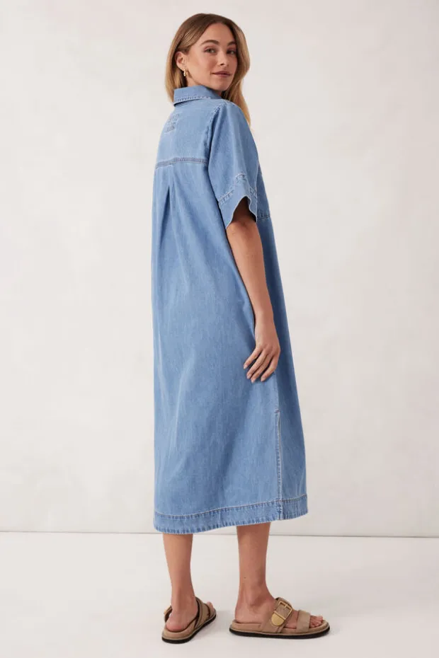 Relaxed short sleeve midi dress in lightweight denim with yoke and sleeve seam detail. Perfect for effortless wear across seasons.