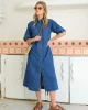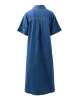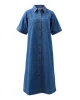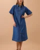 Discover the short sleeve yoke detail midi dress in lightweight denim. Features a boxy fit, curved yoke, and pockets.