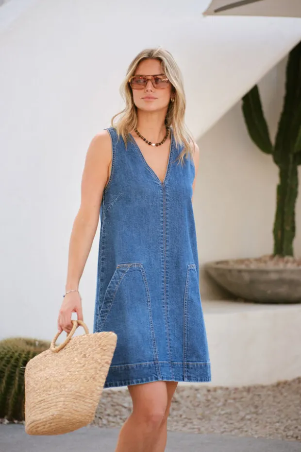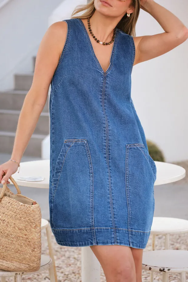 Relaxed denim shift dress with a mini length and roomy patch pockets. Perfect for effortless summer style.