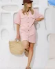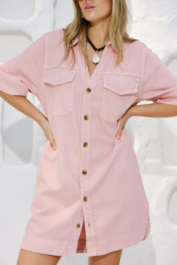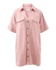Boxy pink mini dress with a relaxed fit, shaped hem, side splits, and hidden snap closures on front pockets.