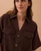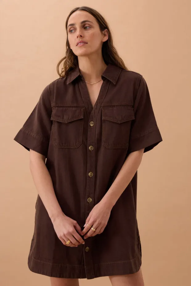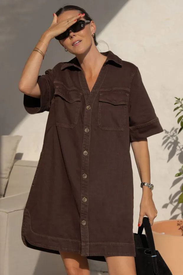 Chcoclate brown boxy mini dress with a relaxed fit, shaped hem and pockets. Crafted from 100% organic cotton.