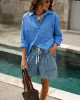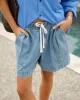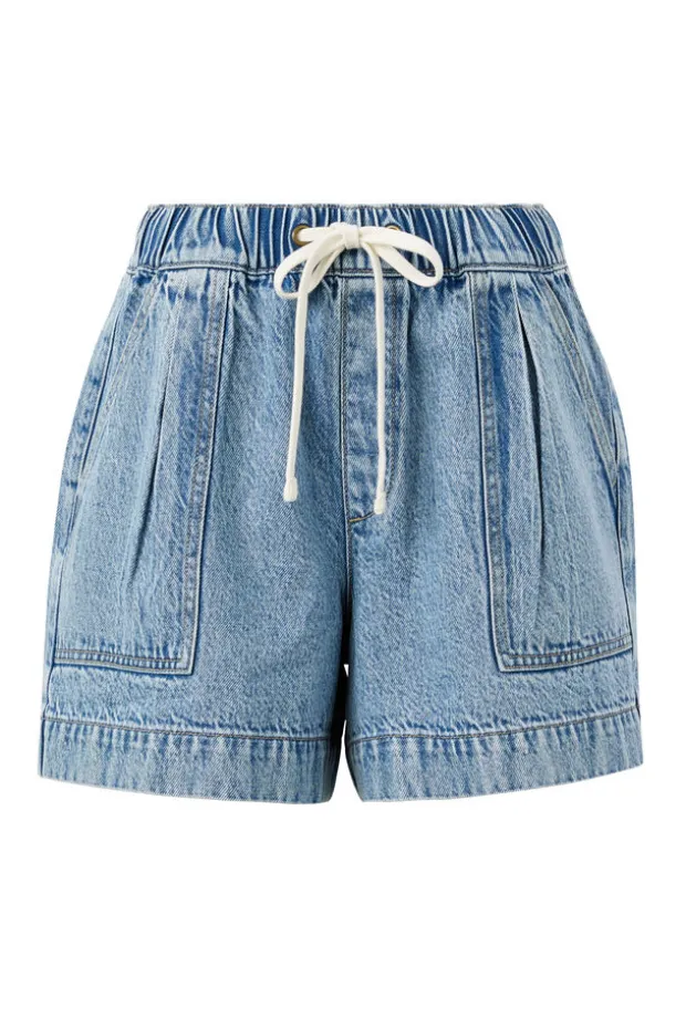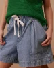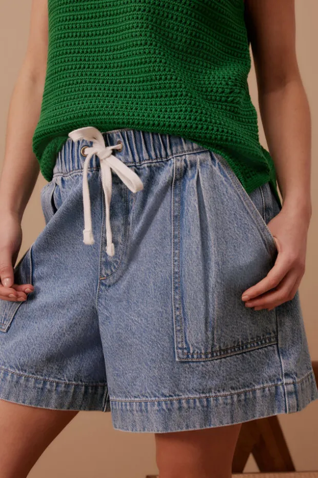 Relaxed denim shorts with slouchy fit, wide leg, mid-thigh length, elastic waistband, draw cord, front pleats, and pockets.