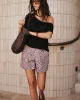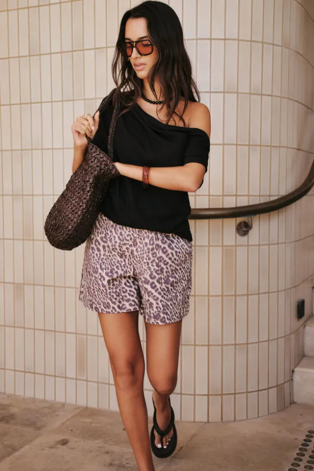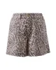 Leopard print denim shorts in a cotton lyocell blend with angled patch pockets and half waist elastic for comfort. Perfect for summer days.