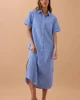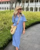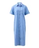 Meet the blue striped midi shirt dress, crafted from a textured organic cotton. Its relaxed fit design make it effortless for busy days, as seen on Jacqui Felgate.