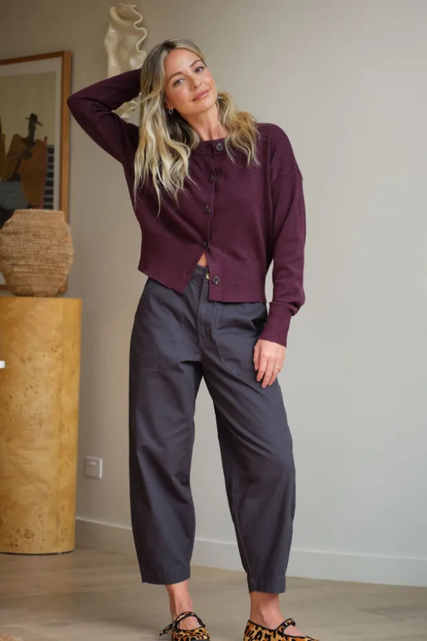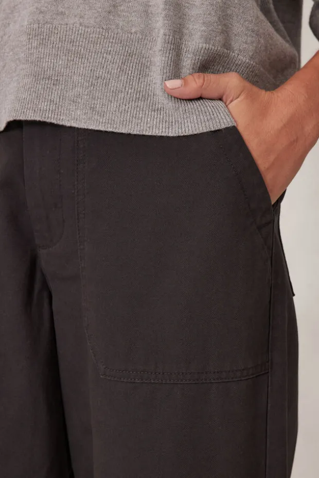 Embrace comfort with these relaxed barrel silhouette pants. Featuring a slightly cropped length, spacious patch pockets, and elastic back waist.