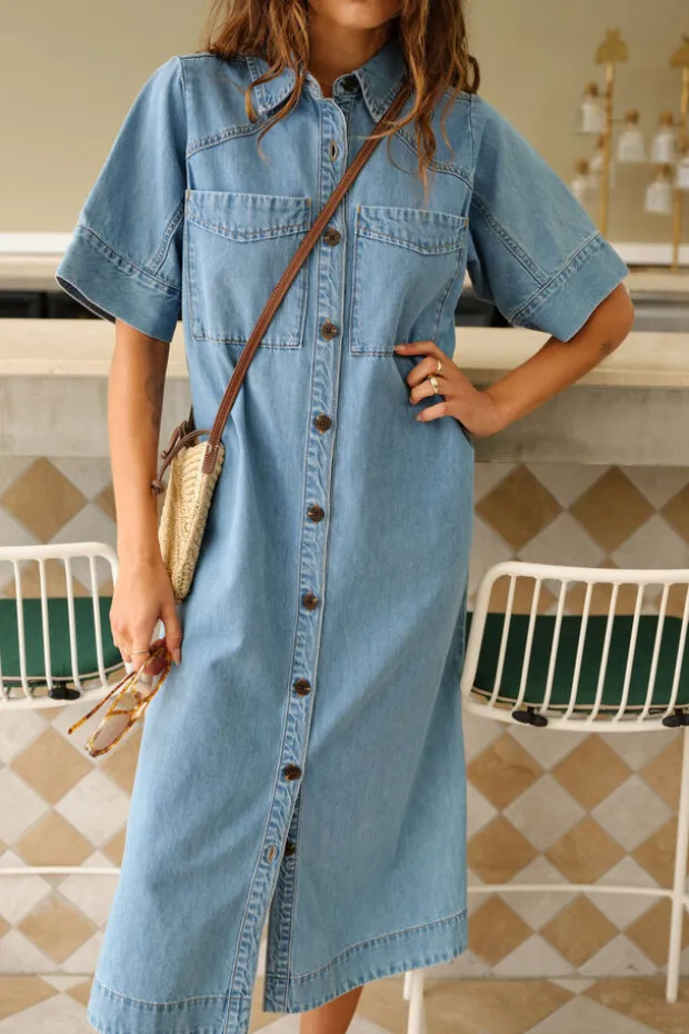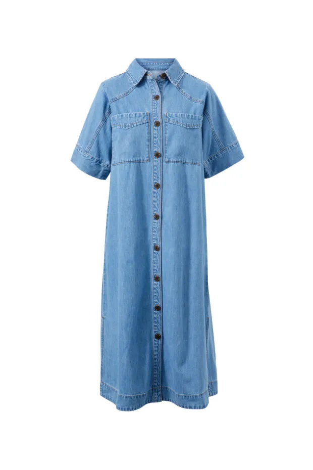 Relaxed short sleeve midi dress in lightweight denim with yoke and sleeve seam detail. Perfect for effortless wear across seasons.