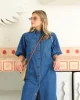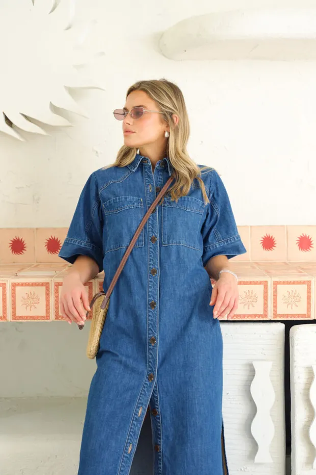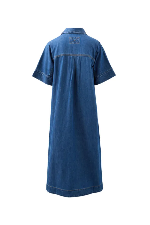 Discover the short sleeve yoke detail midi dress in lightweight denim. Features a boxy fit, curved yoke, and pockets.
