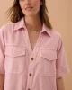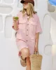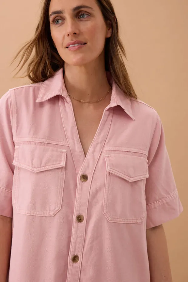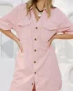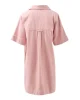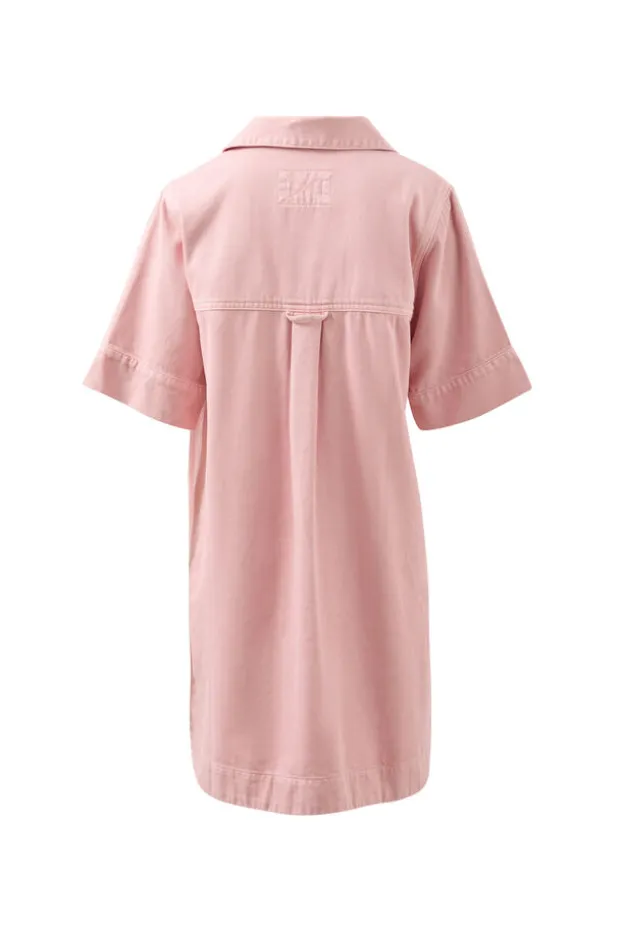 Boxy pink mini dress with a relaxed fit, shaped hem, side splits, and hidden snap closures on front pockets.
