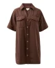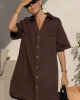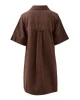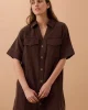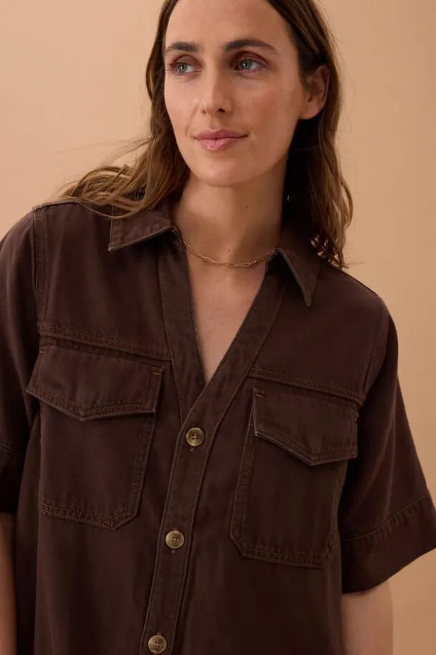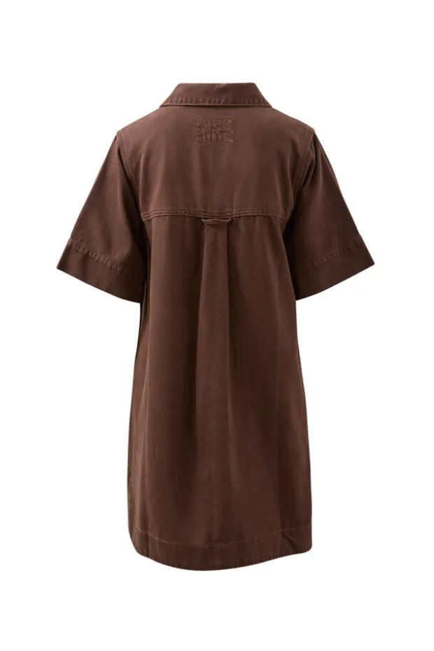 Chcoclate brown boxy mini dress with a relaxed fit, shaped hem and pockets. Crafted from 100% organic cotton.