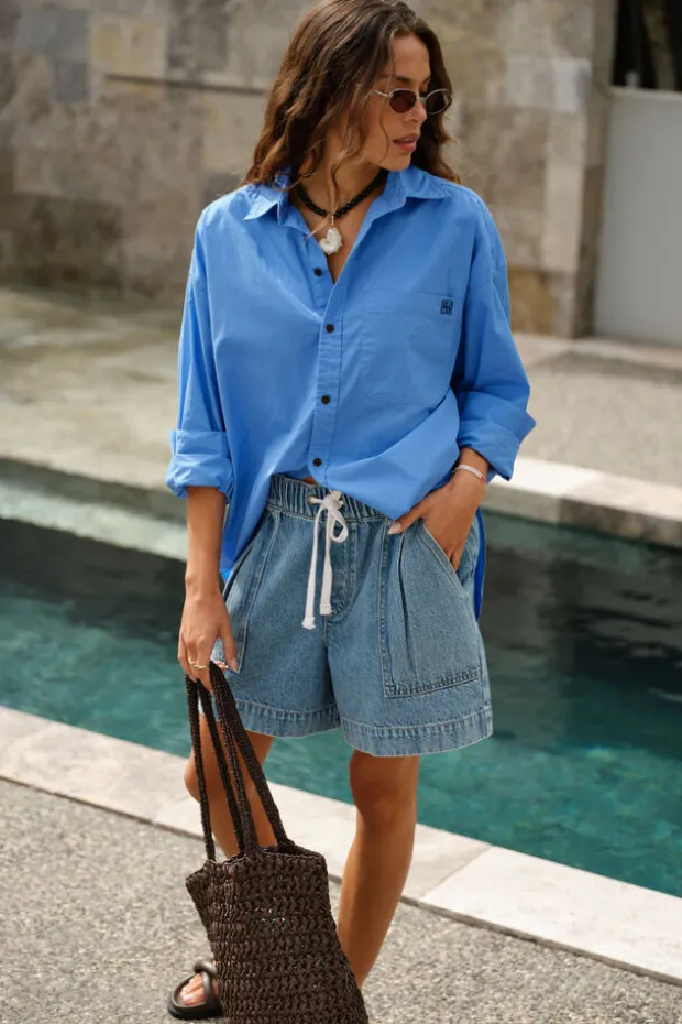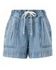 Relaxed denim shorts with slouchy fit, wide leg, mid-thigh length, elastic waistband, draw cord, front pleats, and pockets.