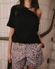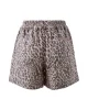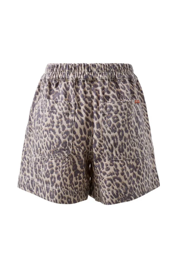 Leopard print denim shorts in a cotton lyocell blend with angled patch pockets and half waist elastic for comfort. Perfect for summer days.