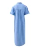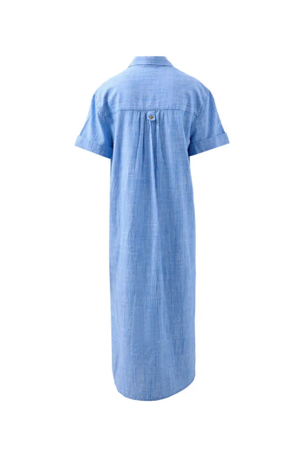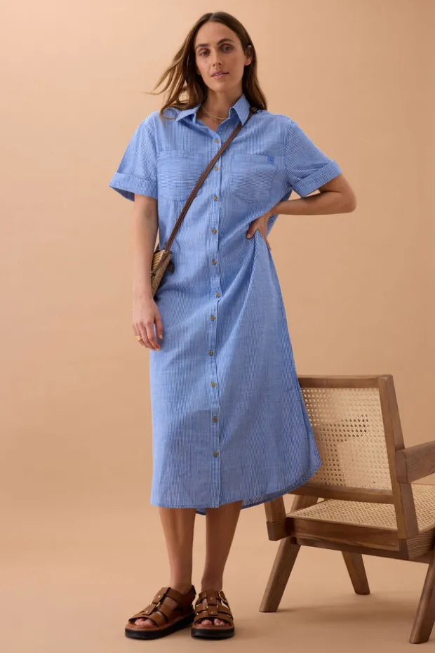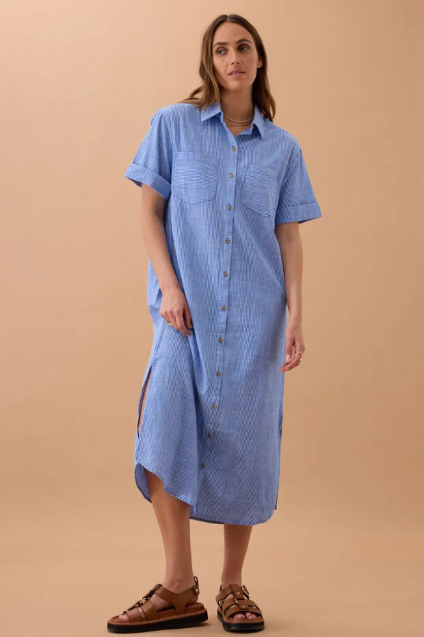 Meet the blue striped midi shirt dress, crafted from a textured organic cotton. Its relaxed fit design make it effortless for busy days, as seen on Jacqui Felgate.