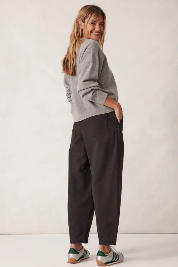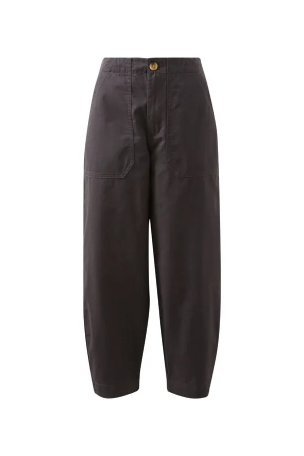 Embrace comfort with these relaxed barrel silhouette pants. Featuring a slightly cropped length, spacious patch pockets, and elastic back waist.