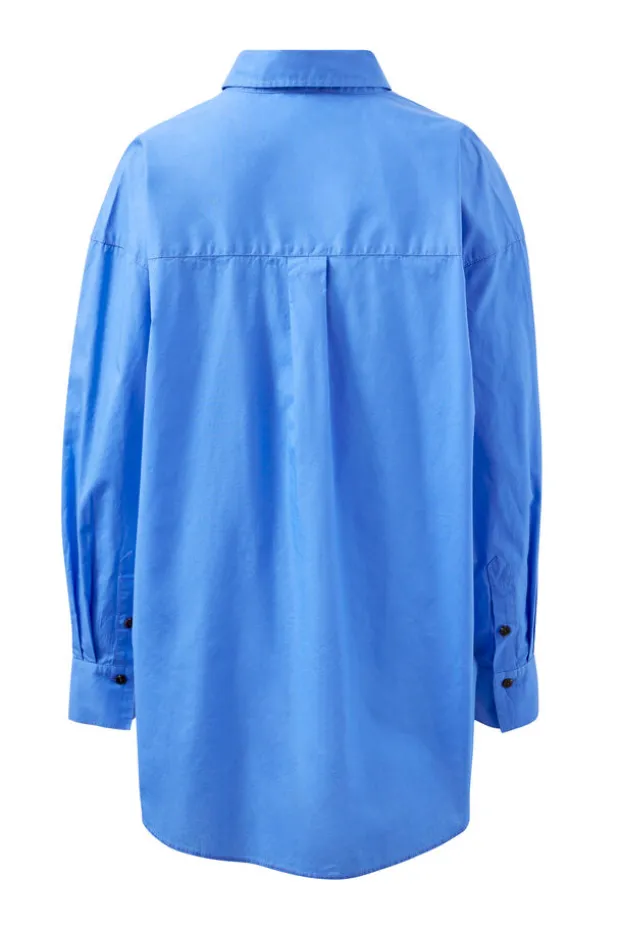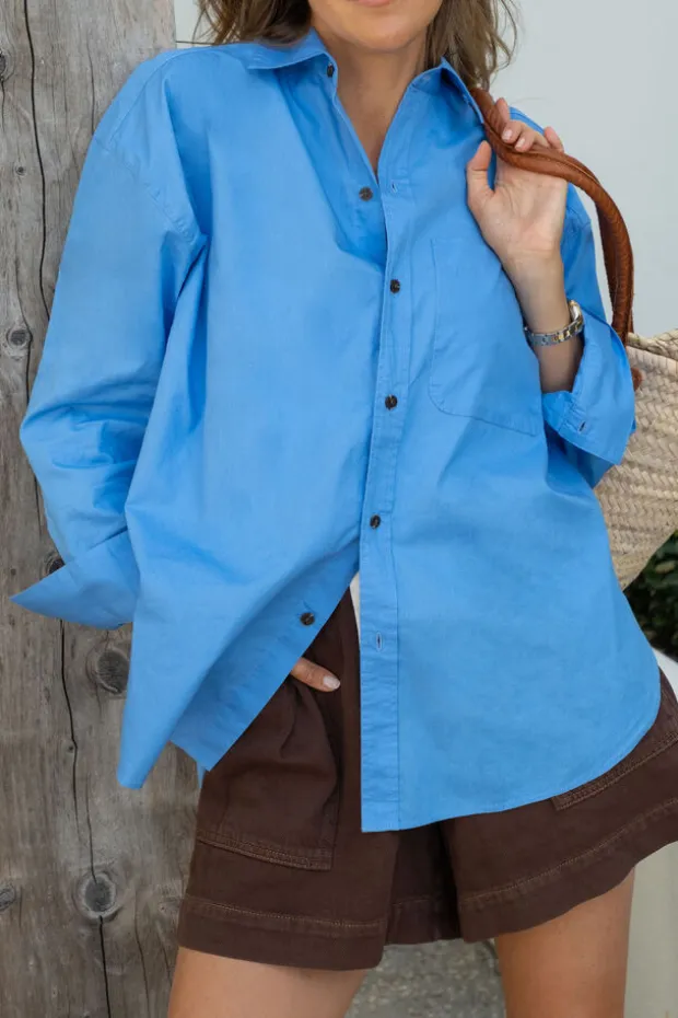 Discover comfort with this blue oversized organic poplin cotton shirt. Perfect for everyday wear, as seen on Jacqui Felgate.